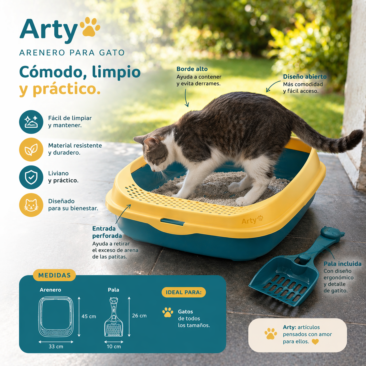 Fabricado con material resistente y duradero, este arenero es ideal para el uso diario. Incluye una pala ergonómica que permite limpiar fácilmente y mantener el espacio siempre higiénico.