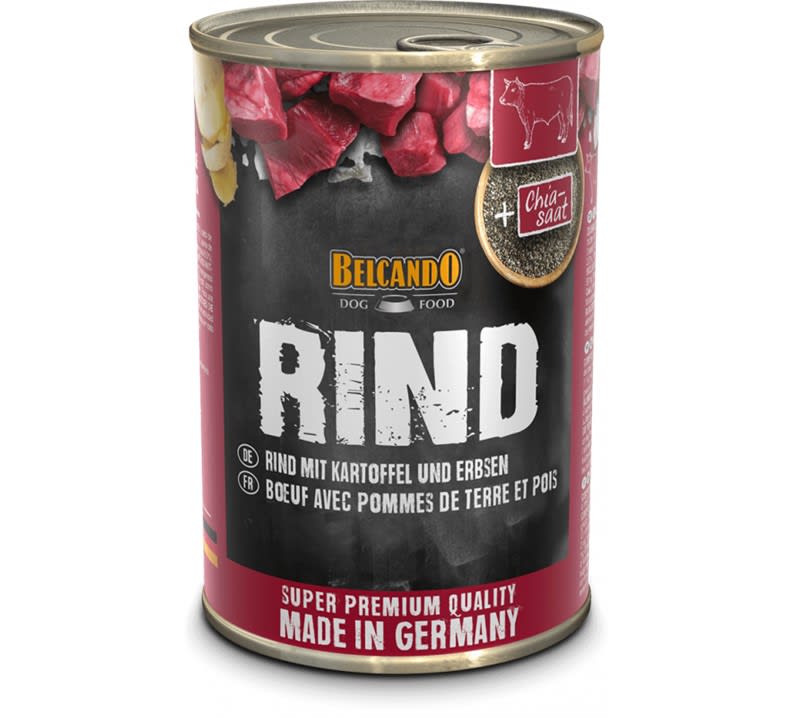 BELCANDO Rind Ternera con Patata y Guisantes en lata es un sabroso alimento húmedo y calidad superpremium para perros de todas las edades. Formulado con Ingredientes procedentes de la agricultura alemana controlada. No utilizan despiece, solamente piezas enteras que son cuidadosamente cocinadas. Cada variedad se completa con Ingredientes seleccionados y contiene valioso aceite de cardo, rico en ácidos grasos insaturados.
