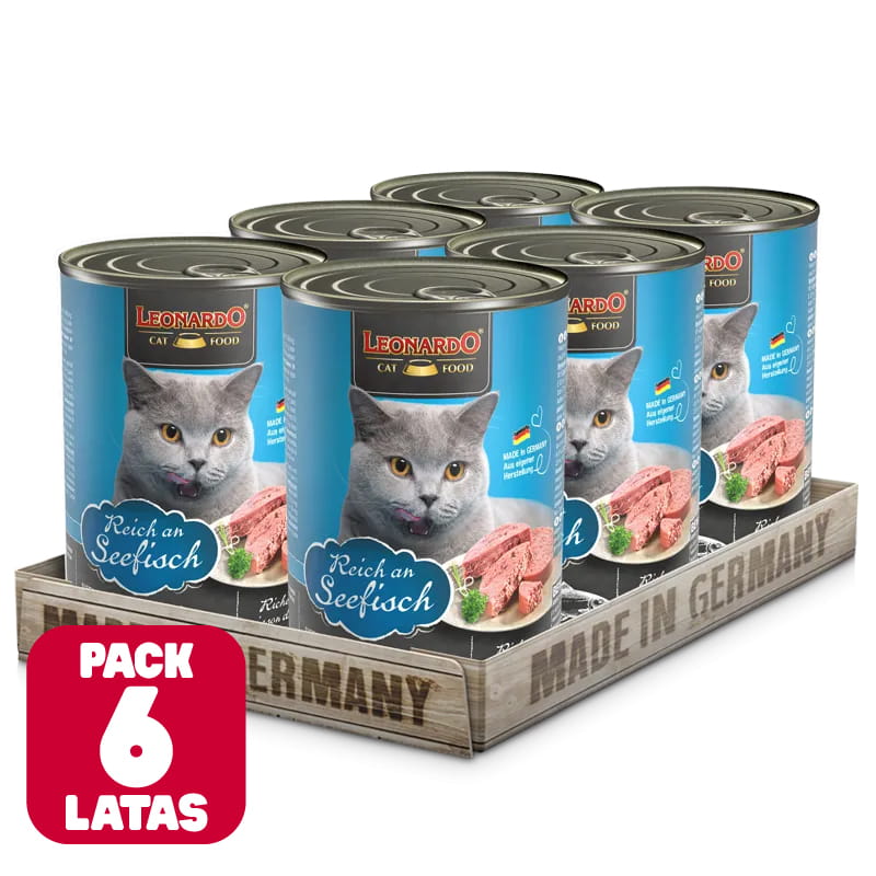 LEONARDO Quality Selection Seefish es un alimento húmedo en lata indicado para gatos adultos rico en pescado de mar. En su fórmula solamente se utilizan productos cárnicos frescos. Gracias a la alta disponibilidad biológica y a la alta calidad de estos productos, su gato necesita una cantidad relativamente pequeña para satisfacer sus necesidades nutricionales diarias. Los gatos, al igual que los felinos que viven en el medio natural, son carnívoros. Este es el por qué solamente se utilizan productos cárnicos frescos. Gracias a la alta disponibilidad biológica y a la alta calidad de estos productos, su gato necesita una cantidad relativamente pequeña para satisfacer sus necesidades nutricionales diarias