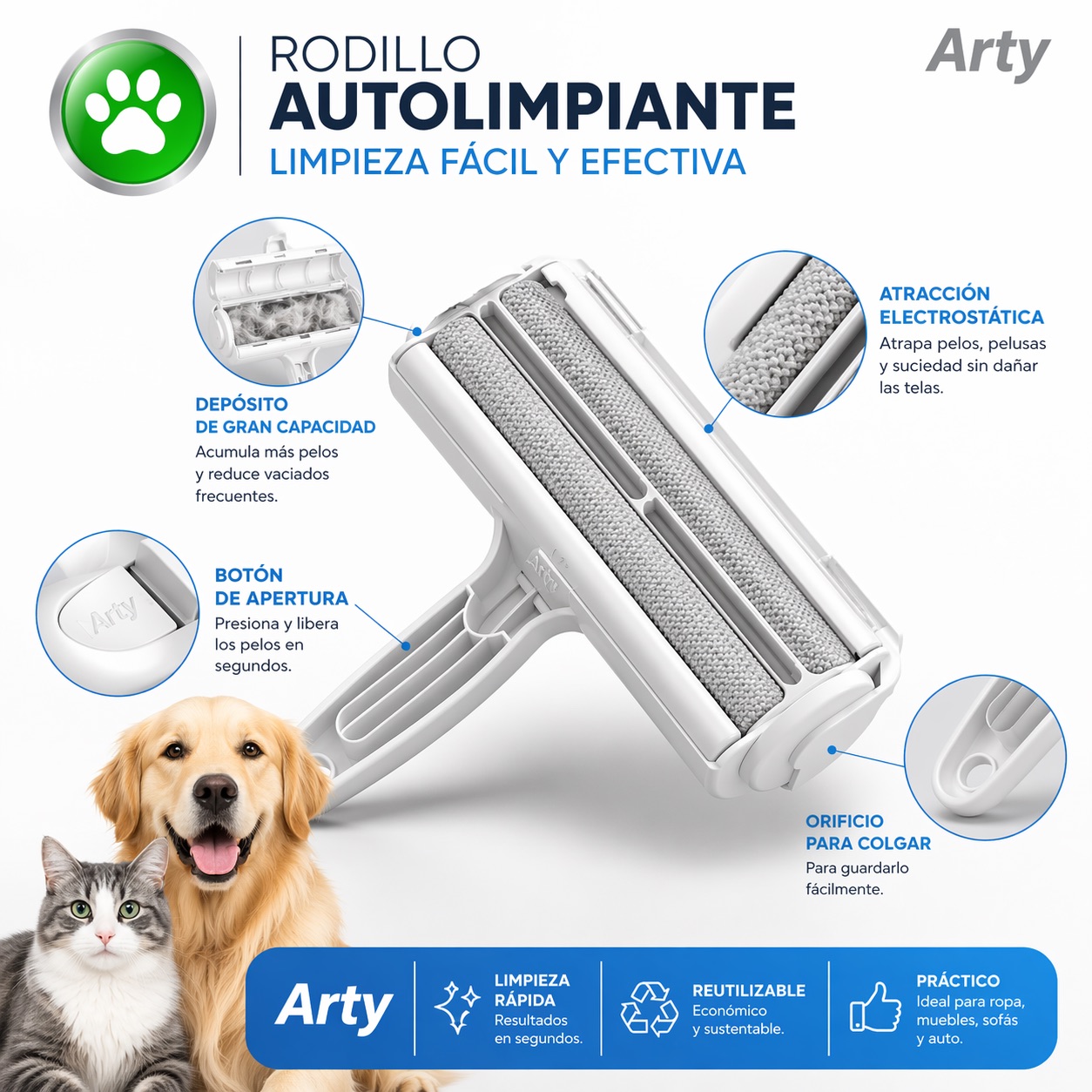 Rodillo removedor de pelos mascotas autolimpiante reutilizable. Ideal para ropa, sofás, alfombras y auto. Limpieza fácil y eficiente.