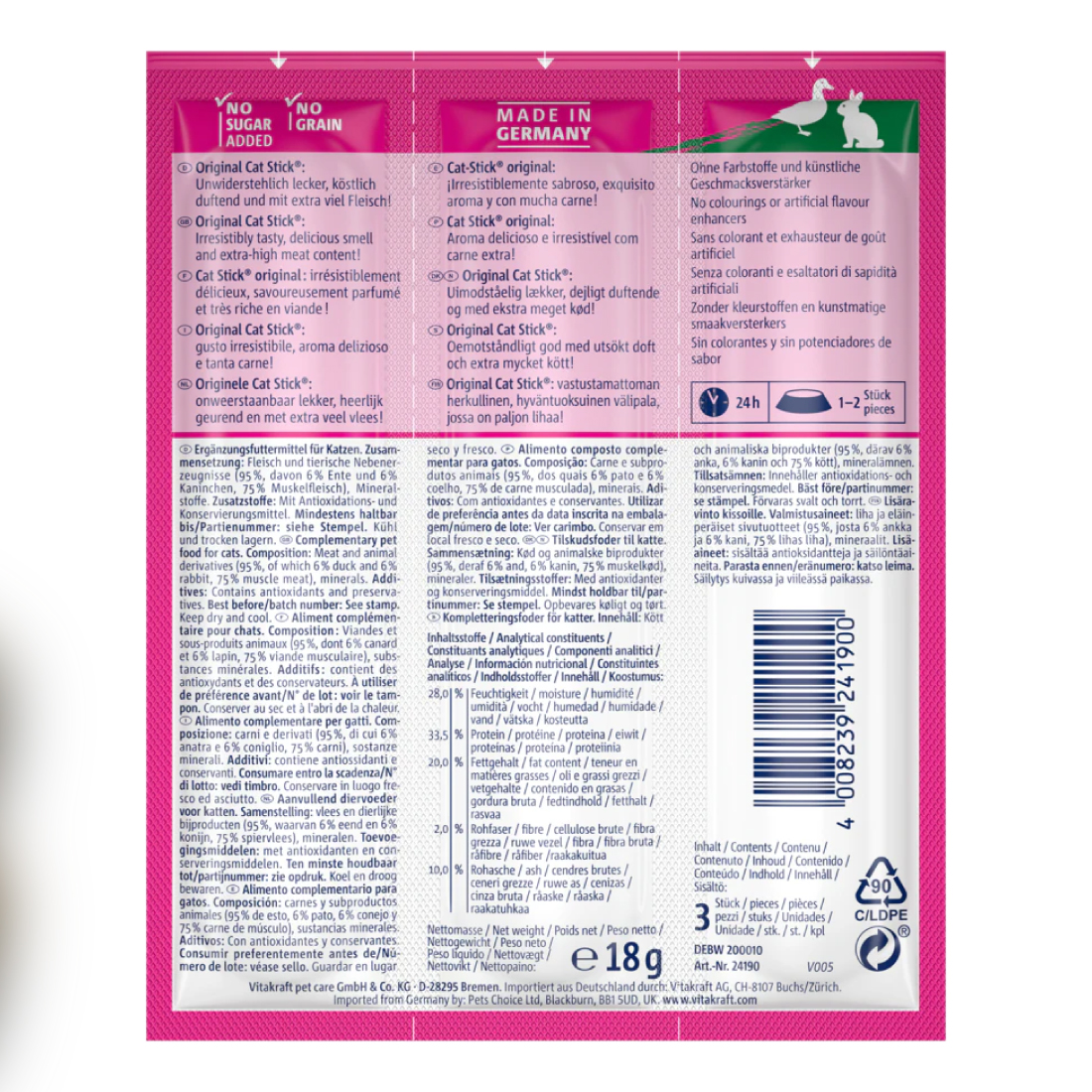 Los Vitakraft Cat Stick Conejo y Pato son snacks premium para gatos con alto contenido de carne, irresistiblemente jugosos y con un aroma que encantar�� a tu felino. Sin colorantes ni potenciadores de sabor, ofrecen una forma deliciosa y saludable de premiar a tu gato.